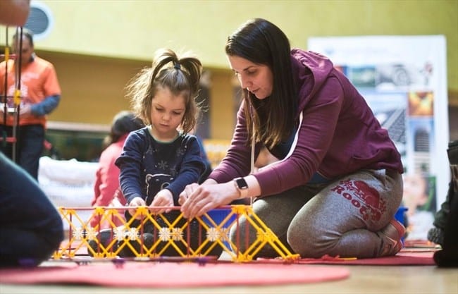 Family engineering teams hunkered down on mats on the museum’s main floor next to boxes filled to the rim with K’Nex building pieces, carefully planning and constructing their bridges. Those with limiting bridge-building experience were not left on their own.